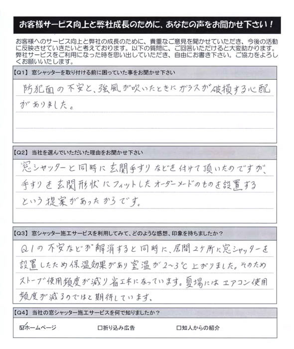 【Q1】の不安などが解消すると同時に、居間2ヶ所に窓シャッターを設置したため、保温効果があり、室温が2〜3℃上がりました。そのためストーブ使用頻度が減り省エネになっています。夏場にはエアコン使用頻度が減るのではと期待しています。
